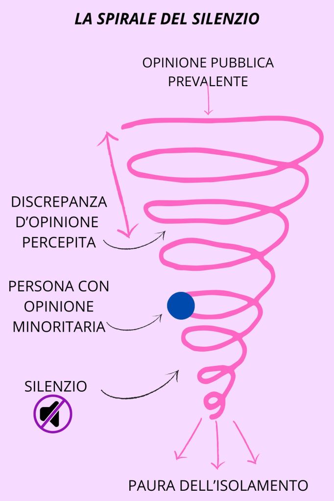 La fiducia in sé permette di ascoltare tutti con sano “distacco”, estrapolando dal discorso ciò che veramente riteniamo essere utile per noi e senza lasciare che l’emotività ed il pessimismo altrui possano influenzare il nostro modo di vedere le cose, il nostro stato d’animo o le nostre decisioni. E’ servita tantissima terapia psicologica per iniziare finalmente a capire che anche io ho voce in capitolo e che non sono solo le opinioni degli altri a contare e ad avere diritto di esistere e di essere considerate. Se gli altri si sentono in un certo modo, o la vedono diversamente da come la vediamo noi, non significa che è necessario adeguarsi al loro modo di vedere e pensare. Solo perché il sentimento degli altri appare essere quello più diffuso e maggioritario non significa che dobbiamo farci fagocitare dalla famosa spirale del silenzio di Elisabeth Noelle-Neumann (schema sulla destra).